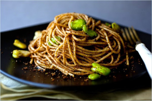SPAGHETTI w/FAVA, BREAD CRUMBS & MARJORAM