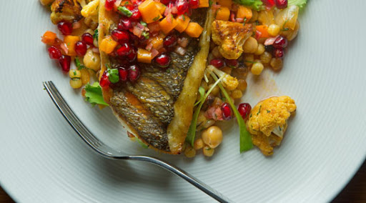 Grilled Orata with Cauliflower, Fregola, and Persimmon-Pomegranate Salsa