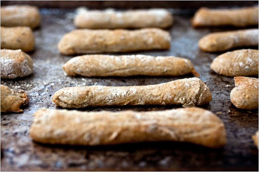 4. Preheat the oven to 400 degrees with the racks positioned in the middle and upper thirds of the interior space. Brush sheet pans with olive oil. Cut the dough crosswise into four equal pieces. Cut each piece crosswise into six equal pieces. Roll each between the board and your hands as you were making a rope until it is as long as the baking sheet. For a tighter strip, twist the strands from one end to the other. Place 1 inch apart on the baking sheets until you’ve filled two baking sheets. Continue to shape the remaining breadsticks while the first batch is baking.