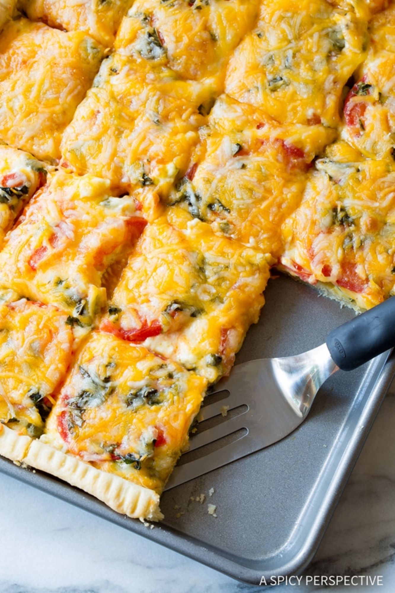 Bake on the low rack for 30 minutes, until the crust is golden and the cheese has melted. Cool for 5 minutes, then cut and serve warm.