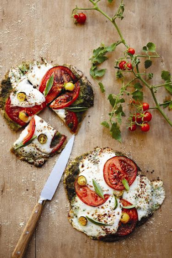 PLACE one flatbread dough round on a work surface. Spoon the pesto sauce over the dough, spreading to coat evenly, and layer with the remaining ingredients. Place the flatbread on a baking sheet and bake until the dough is crisp and the cheese is melted, about 10 minutes.
