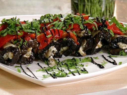Top each eggplant roulade with a roasted red pepper strip. Garnish with chiffonade of arugula, a drizzle of olive oil and the balsamic reduction.