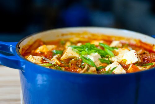 Bring to a boil and taste for spiciness. Add as much gochugaru to taste until it’s pleasantly tingly (I usually add about 2 Tbs, but this may be way to much for some people). Add the tofu, turn down the heat to a simmer and let it cook for 15-20 minutes, or until the pork and kimchi are tender.