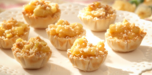 Flaky phyllo cups are filled with a combination of Granny Smith apples, cinnamon and butter, then sprinkled with crushed shortbread cookies. -