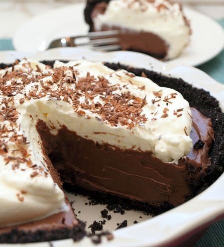 5. Up to 3 hours before serving, make topping: Place heavy cream in chilled mixing bowl. Using an electric mixer, whip on medium-low speed until whisk or beaters begin to leave tracks in the cream. Add sugar and whip until the cream holds medium, silky peaks. Go slowly towards the end; if it gets grainy or curdled, you’ve gone too far. Spread whipped cream over pie, leaving some of the chocolate filling showing around the edges. Sprinkle with grated chocolate and refrigerate until ready to serve.