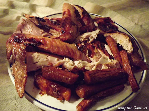 Half-way through the cooking process rub with Uncle Dougie's BBQ sauce. Cover the breast part of the turkey with a loosely fit aluminum foil tent and finish cooking.