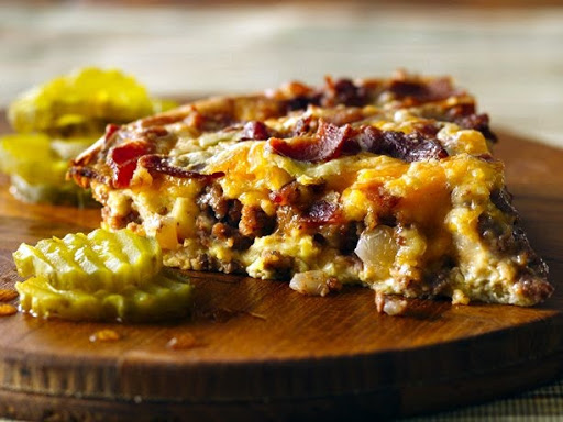 2) In same skillet, cook beef, pepper and onion over medium-high heat 5 to 7 minutes, stirring occasionally, until beef is thoroughly cooked; drain. Stir in ketchup. Spread in pie plate; sprinkle with cheese and bacon.