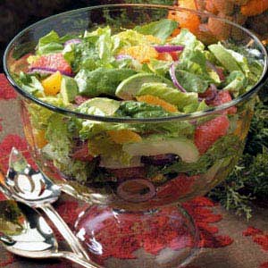 1. In a large salad bowl, gently toss the greens, grapefruit, oranges, avocados and red onion. In a jar with a tight-fitting lid, combine the dressing ingredients; shake well. Drizzle over salad and toss to coat. Yield: 12 servings.