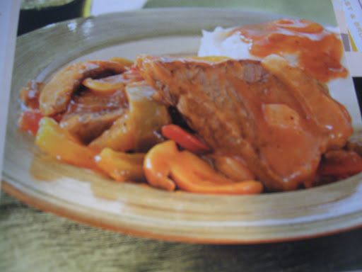 Cut steak into serving size pieces. Place in 5 qt. slow cooker. Add peppers, mushrooms, onions, water, s&p. Pour tomato sauce over the top. Cover and cook on low for 6 to 6 1/2 hours or till meat is tender.