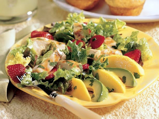 3 Cut chicken into slices. In large bowl, toss salad greens, chicken and strawberries; divide among 4 plates. Arrange mango and avocado around each salad. Sprinkle with cilantro. Drizzle with reserved dressing.