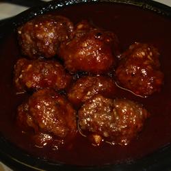 Meanwhile heat the jelly, chili sauce and mustard together in a 2 quart Dutch oven. Drain and add meatballs to the Dutch oven. Cover and simmer on low for 1/2 hour. Serve hot in chaffing dish with toothpicks.