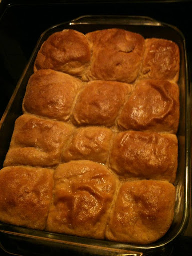 When done, remove from oven. Rub a stick of cold butter over the tops of the rolls.