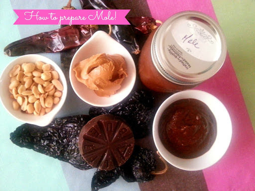 Start roasting the peanuts, the garlic and the onions in a pan at medium heat. When grilled take them out of the pan and place ingredients in a plate for later use. In a soup pan place the chiles (remove stems) and the roasted garlic, onion and peanuts, cover with water and cook for 15-20 minutes at medium heat or until chiles are soft. Then place the cooked chiles with the peanuts, the garlic and the onion in the food processor and mix well until getting a smooth but thick consistency. Pour this paste again in the soup pan and add rest of the ingredients, including the peanut butter, the seasonings and the Mexican chocolate cut in chunks. You can add water if needed but not too much since mole sauce needs to be thick and creamy. Stir with a whisk and let sauce to simmer for another 20 minutes until all ingredients incorporate together and the chocolate is melted.