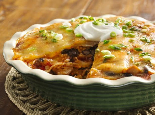 Heat oven to 350°F. Spray 9-inch round (2-quart) glass baking dish or casserole with cooking spray. Cut 5 of the tortillas in half. Cut remaining tortillas into 2 1/2-inchwide strips.