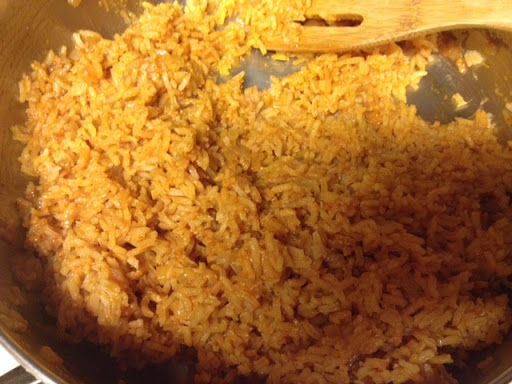 Pour the liquids into the hot pan very slowly with the rice, being very careful of the stream and liquid that may spatter up. Stir to combine ingredients.