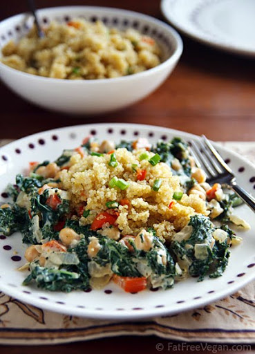 2. In a large non-stick skillet, cook the onion until it begins to brown, about 5-7 minutes. Add the red bell pepper and garlic, and cook for another minute. Add the chickpeas, kale, and two tablespoons water. Cover immediately and reduce heat to medium. Cook, stirring often, until kale is tender, about 5 minutes.