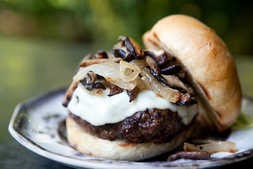 5. When the burgers are almost done, lay the swiss cheese over them and allow the cheese to melt. Paint the burger buns with a little olive oil and toast them on the griddle or grill grates. To assemble, put a burger on the bun and top with the sauteed onions and mushroom mixture.