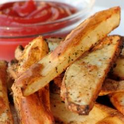 Cut potato into wedges. Mix olive oil, paprika, garlic powder, chili powder and onion powder together. Coat potatoes with oil/spice mixture and place on a baking sheet.
