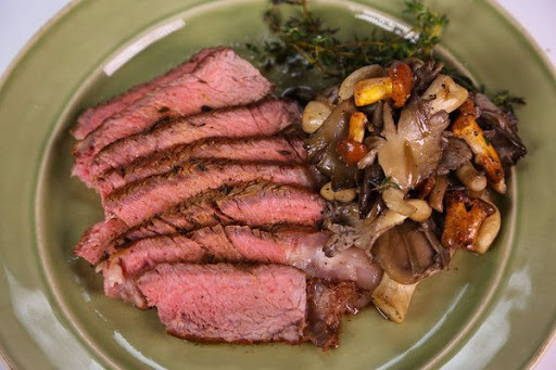 instructions Meanwhile, finish the mushrooms by drizzling with red wine vinegar and a pat of butter. Slice steak and serve with mushrooms.