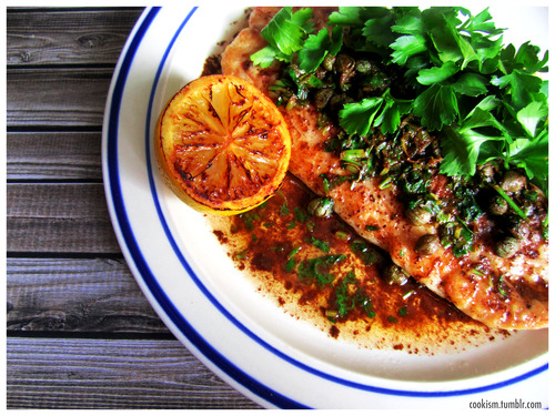4. Heat and melt butter in a pan over medium heat until brown. Once butter has turn brown, turn off the heat immediately. Stand back and squeeze lemon juice into the pan as it will splutter. Stir in parsley, lemon zest and capers.