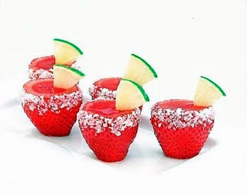 Pour final Jell-o mix into strawberries and chill overnight. Dip your finger in water or use a moistened brush to wet the edge of the strawberries, dip and rotate the strawberries in salt to rim. Garnish with cut lime triangles to finish.