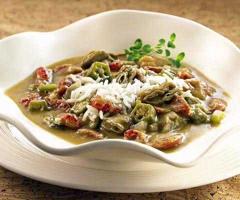 5. Stir in filé powder and ladle gumbo into individual bowls. Top with rice and serve.
