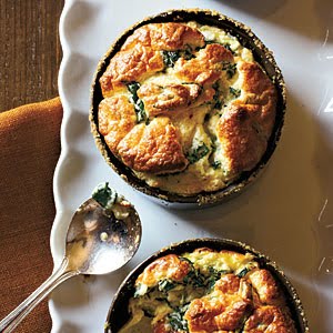 5. Combine egg whites and cream of tartar in a large bowl, and let stand at room temperature for 15 minutes. Beat with a mixer at high speed until medium peaks form (do not overbeat). Gently stir one-fourth of egg whites into spinach mixture, and gently fold in the remaining egg whites. Gently spoon mixture into prepared dishes. Sharply tap dishes 2 or 3 times on counter to level. Place dishes on preheated baking sheet; return baking sheet to 425° oven. Immediately reduce oven temperature to 350°; bake soufflés at 350° for 21 minutes or until puffy and golden brown. Serve immediately.