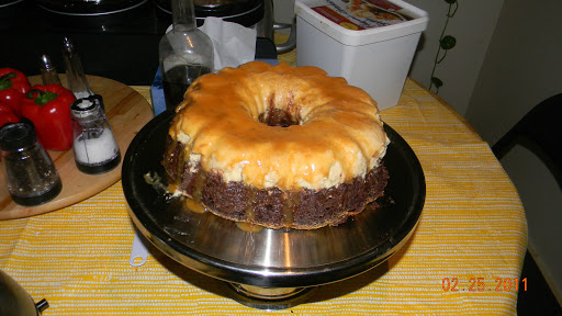 Scoop the cake batter into the prepared Bundt pan and spreading evenly. Slowly pour the flan mix ture over the cake batter. Cover with foil and add about 1-inch of hot water to the roasting pan.