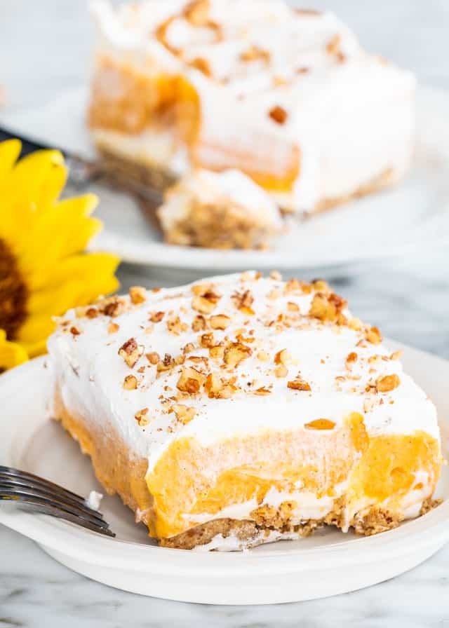 Once the crust has cooled completely, spread the cream cheese mixture over the crust evenly. Next spread all of the pumpkin mixture evenly. Top with the Cool Whip then sprinkle with reserved 1/2 cup chopped pecans.