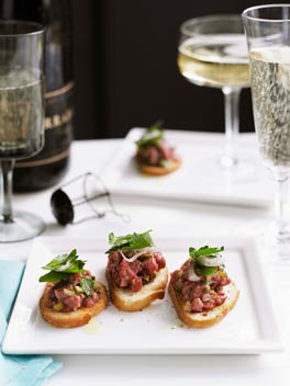I unabashedly love beef tartare and yes, this is my favorite crostini, particularly because I gild the lily with a drizzle of truffle oil! Steak tartare has been around for a good long time, and according to legend, its name refers to the Tartars, the nomads who roamed eastern Europe, for a time under the leadership of Attila the Hun. Fierce and bloodthirsty, the Tartars purportedly ate raw meat for strength. Tartars were Huns, but "beef hun" just doesn't have the panache of beef, or steak, tartare. If you've never had beef tartare, try it my way; then make it your way by omitting what you may not like such as capers, Worcestershire sauce, or anchovies. But don't fool with the beef. Buy the best you can from a reputable butcher. I use prime beef when possible, but because it is sometimes hard to find, I may turn to high-quality choice beef instead.
