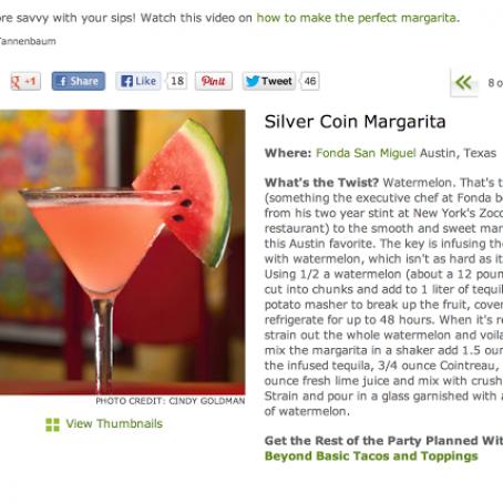 To mix the margarita in a shaker add 1.5 ounces of the infused tequila, 3/4 ounce Cointreau, 1/3 ounce fresh lime juice and mix with crushed ice. Strain and pour in a glass garnished with a wedge of watermelon.