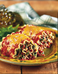 3.Combine ricotta, spinach, 1-1/2 cups Italian cheese blend , 1/2 cup Cheddar cheese and egg in medium bowl. Spread 1/4 cup ricotta mixture over each noodle. Top with 1/3 cup sausage mixture. Tightly roll up each noodle from short end, jelly-roll style. Place rolls, seam sides down, in prepared pan. Pour remaining spaghetti sauce over rolls. Sprinkle with remaining 1/2 cup Italian cheese blend and 1/2 cup Cheddar cheese. Cover pan with foil.