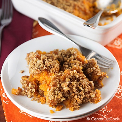 Sprinkle the crust over the casserole after it has baked for 30 minutes. Bake for 10-15 minutes longer, until the pecan crust is lightly browned and crunchy.