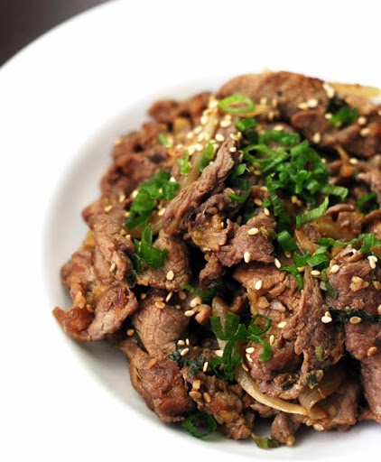 - 1-1.5 lbs. of thinly sliced rib-eye steak purchased from a Korean market. Or you can slice your own rib-eye or sirloin steak across the grain in paper thin slices. Partially freezing the beef helps with cutting clean slices.