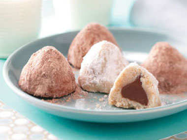 Sift together 2/3 cup confectioners' sugar and cocoa. While cookies are still warm, roll half in cocoa mixture and half in remaining confectioners' sugar. Cool completely. Store in an airtight container. Yield: 2-1/2 dozen.