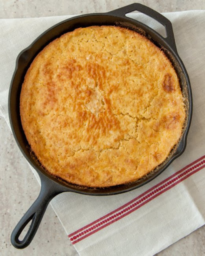 Preheat oven to 350 degrees. Whisk flour, cornmeal, baking powder, and baking soda in a medium bowl; set aside. Generously butter a 10-inch cast-iron skillet, and place in the oven to preheat.