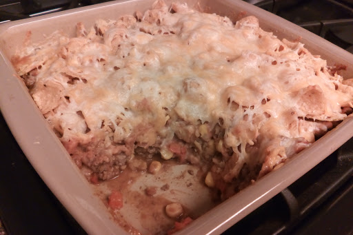 Spoon half of the beef mixture into baking dish. top with half of bean mixture and half of fritos. Top with remaining beef mixutre and bean mixture. Cover with foil and bake 30 minutes.