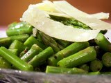 In a medium bowl, toss together the asparagus, shallots and vinegar. Drizzle the oil on top of the asparagus. Using a vegetable peeler, shave the Parmesan to measure 1/3 cup. Toss the cheese with the asparagus and season with salt and pepper.