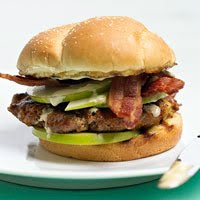 4. To assemble the burgers, layer apple slices and grilled burgers on the toasted bun bottoms. Top each with one and a half slices bacon. Spread a generous layer of the mayonnaise mixture on the cut side of bun tops before placing atop burgers. Makes 4 servings.