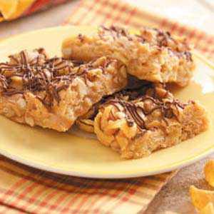 Add remaining corn chips and peanuts to remaining syrup; stir until combined. Spoon over mixture in pan; press down lightly. Drizzle with melted chocolate. Cool before cutting. Yield: 2 dozen.