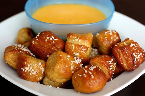*If you want to make cinnamon and sugar pretzel bites-instead of adding salt, sprinkle the bites with cinnamon and sugar. For the frosting mix-soft cream cheese-about 3 T, powdered sugar, a teaspoon of vanilla extract, and a little bit of milk. Whisk together. Add more milk if it is too thick, if it is too thin, add more powdered sugar. I don't measure. I just guess until the consistency is right.*
