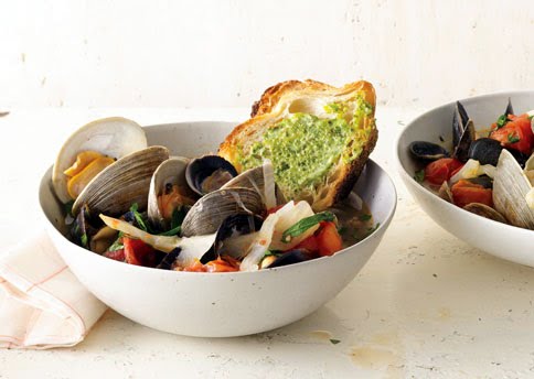 Briny shellfish give this quick bouillabaisse its depth of flavor. Basil rouille (a garlicky Provençal mayonnaise) adds vibrancy.