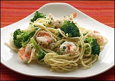 I still love the flavor combination, though, so I've used it in a new dish. The shrimp is cooked with garlic in olive oil, and a quick pan sauce is made with the addition of white wine. Broccoli lends good color and a flavor of its own. The whole thing is tossed with spaghetti and finished with parsley for a meal balanced in both taste and nutrition. Best of all, it's delicious and no longer a guilty pleasure.