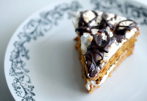 To assemble cake: heat oven broiler on a low setting. Place one cake on a piece of foil on a cookie sheet; spread a generous amount of marshmallow frosting on top. Broil cake for a couple of seconds until golden brown. Generously drizzle the top with chocolate ganache. Place other cake on top. Pipe marshmallow frosting on top of cake. Broil for a couple of seconds or until golden brown. Drizzle cake with remaining chocolate ganache.