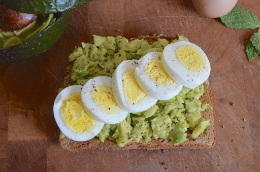 Boil eggs for about 10 minutes. Mash avocado with a bit of olive oil, sea salt and pepper. Toast bread. Spread avocado mash on toast. Slice eggs, then layer on top of avocado. Sprinkle with more black pepper and sea salt, and serve. Makes two open faced sandwiches.
