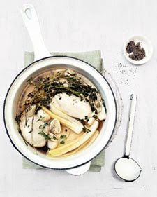 Cut out a circle of parchment the size of the pot. Reduce heat to low. Add thyme. Season chicken generously with salt, and submerge in broth. Place parchment on surface of broth, and cover pot with lid. Poach chicken, flipping halfway through, until cooked through, about 15 minutes. (Broth should never simmer.) Remove and discard thyme if desired. Slice chicken, and serve in broth or on its own.