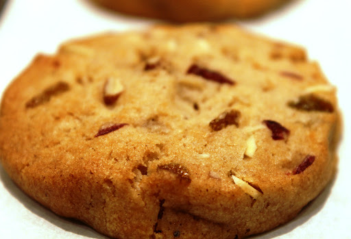 Cream the shortening, butter and sugars until smooth and creamy. Add the eggs and vanilla and mix well. Stir the flour mixture into the creamed mixture (use a wooden spoon to do this-using a mixer will cause the cookie to be tougher in the end). Once the flour is incorporated, stir in the fruit and nuts.