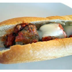 "Meatballs in tomato sauce with melted cheese on a lightly toasted baguette."