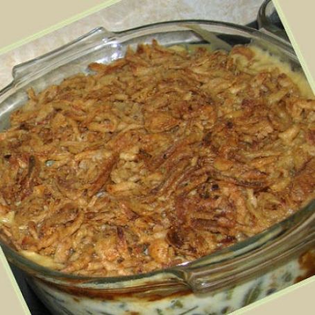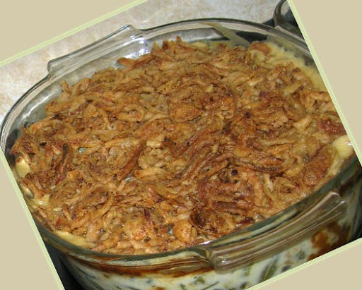 Mix green beans, cheese and soup together. Slowly combining all the ingredients using a rubber scraper/spatula. (Aunt Joy throws in some french fried onion rings with this mixture) Pour into casserole dish. (I do spray this with a non stick cooking spray) Sprinkle and top with french fried onion rings.