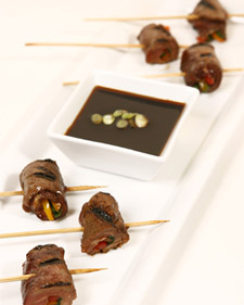 Dip 1 slice beef in the soy sauce mixture, and place it on a clean surface. Sprinkle with salt and pepper. Place 2 pieces of scallion green and 1 piece of each pepper across the shorter length of the beef, so that the vegetables extend over both edges by about 3/4-inch. Roll up lengthwise, and skewer near the edges with 2 toothpicks. Set aside. Repeat with remaining beef and vegetables.